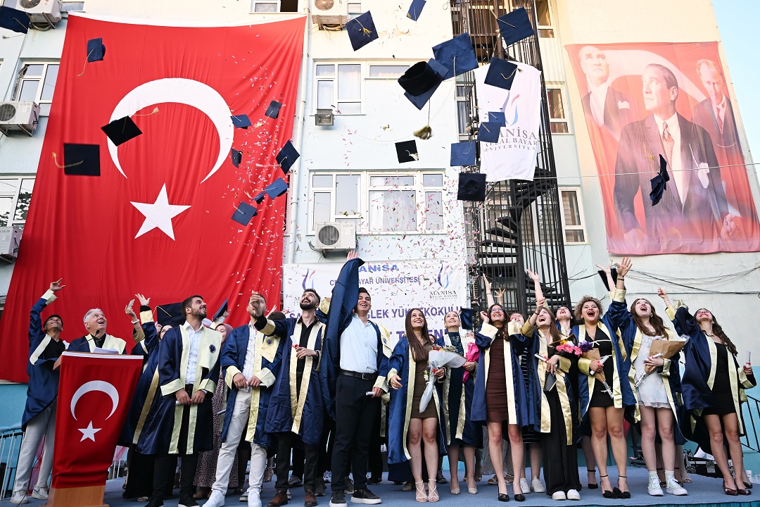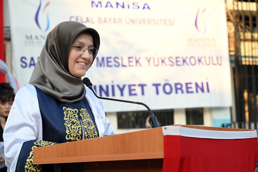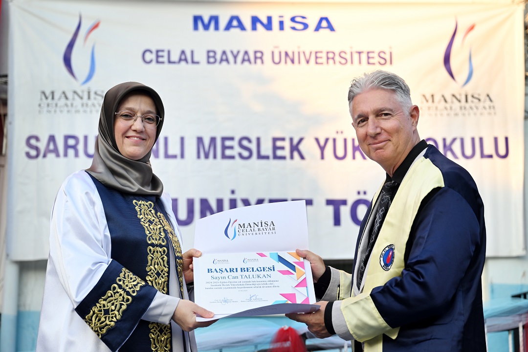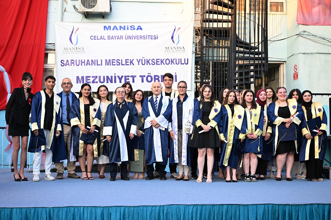The 2024–2025 Academic Year Graduation Ceremony of Manisa Celal Bayar University Saruhanlı Vocational School was held with great enthusiasm in the school courtyard. The ceremony was attended by Rector Prof. Dr. Rana Kibar, Saruhanlı Mayor Ekrem Cıllı, Director of Saruhanlı Vocational School Prof. Dr. Ayşe Dinçer, academic and administrative staff, students, and their families.